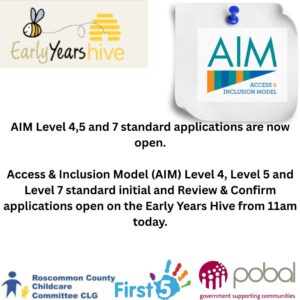 Access & Inclusion Model (AIM) Level 4, Level 5 and Level 7 standard initial and Review & Confirm applications open on the Early Years Hive from 11am today.