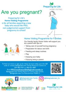 Preparing for Life is a Home Visiting programme based the Ballaghaderreen and surrounds catchment area. The programme is open to pregnant women and with the mother’s consent, we will work with the family until the child is school ready. This is a free evidence-based programme that offers free developmental items at different stages. It is open to voluntary and universal referrals. As part of our ethos in Preparing for Life Ballaghaderreen we aim to empower and support women, children and families and the community to thrive by sharing information and building on the family’s strengths, recognising them as experts of their own lives. For further information, or to sign up to the Programme please contact Stacey -(086) 8224887.